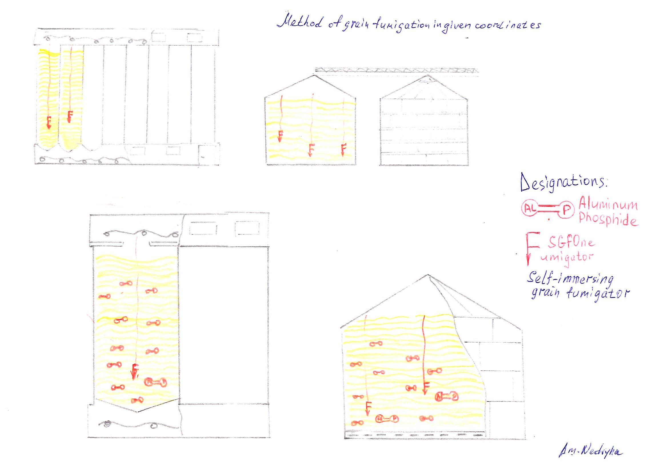 The grain fumigation method developed by Dmitro Nedvyha in 2008 – “Fumigation of grain at given coordinates”(Fumigation of grain at a given point) in a silo grain storage without moving the grain is consists of fumigating stationary grain in a filled grain storage facility; the grain does not need to be moved; a special automated robotic device, a self-immersing grain fumigator, will itself be immersed in the layers of grain to a specified depth (height) of the silo,delivers fumigants Phosphides to a given point (for example, in the epicenter of a cluster of insect pests, diagnosed by an elevated temperature of the grain layer) or to all grain layers, to several given pointsunloads fumigated phosphides and returns back to the upper part of the silo. The robotic device moves along a vertical trajectory (from top to bottom) from a starting point in the uppermost layer of grain from the top of the silo storage, where there is access to the upper layer of grain, and, having delivered fumigants (phosphides) to a specified point at a depth (height), returns back.